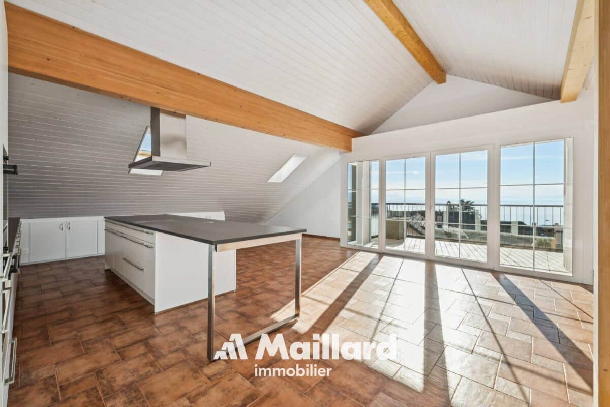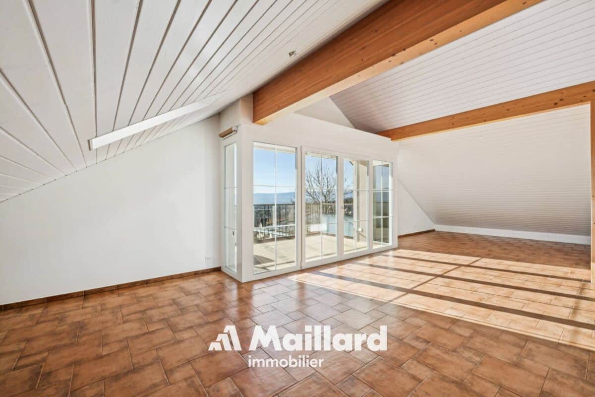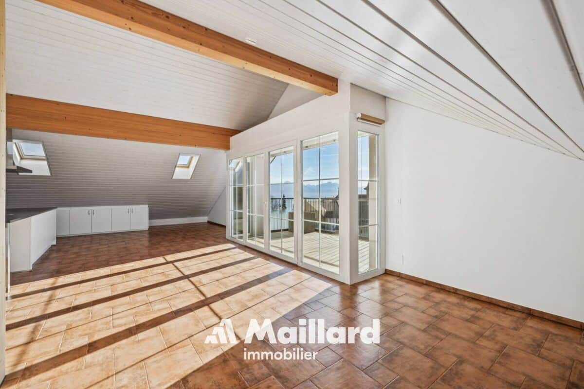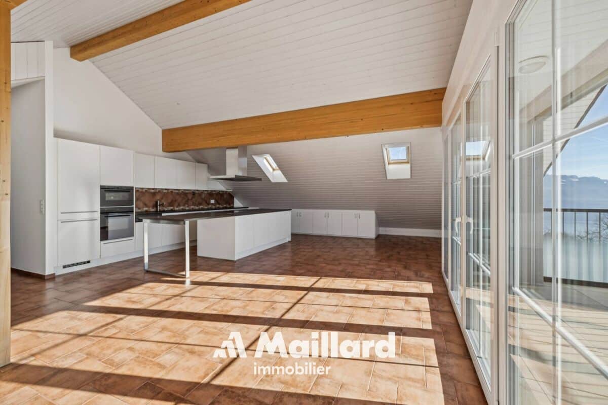 Situé à Belmont-sur-Lausanne, cet appartement se distribue sur 129 m2 dans les combles d'une petite PPE, bénéficiant de beaux volumes et d'une vue panoramique sur le lac Léman et les Alpes.
