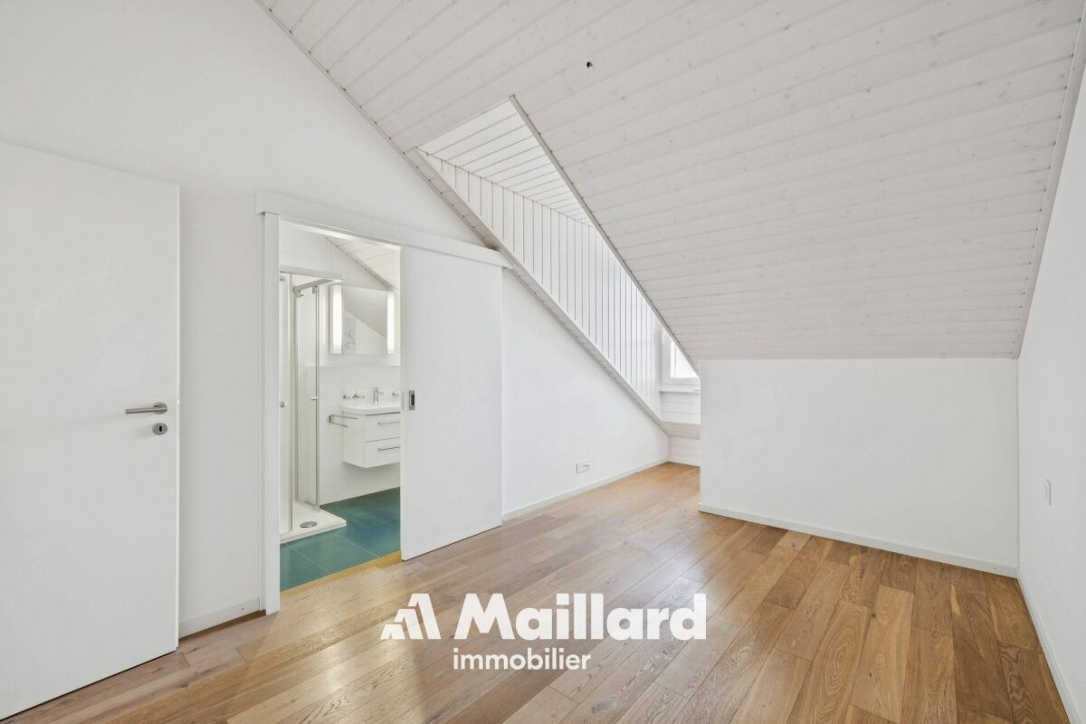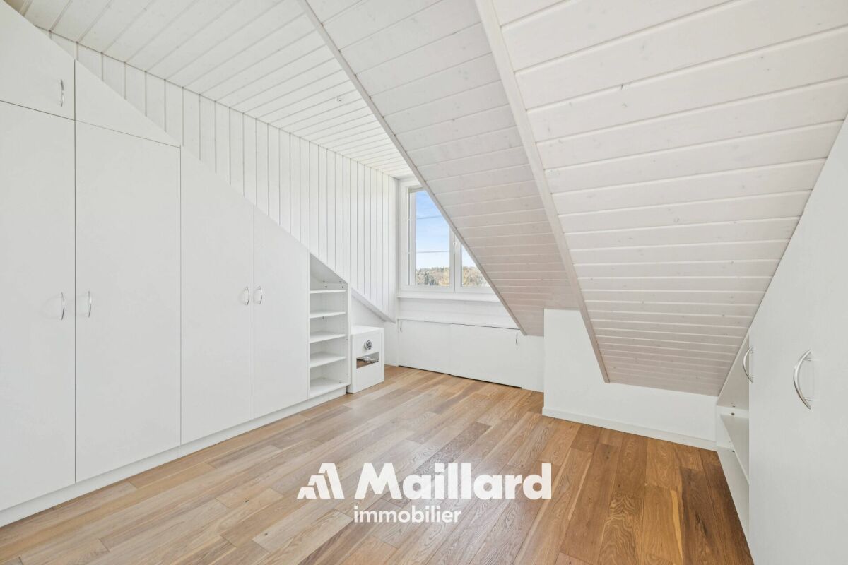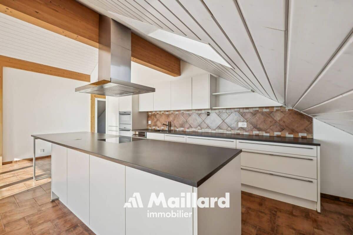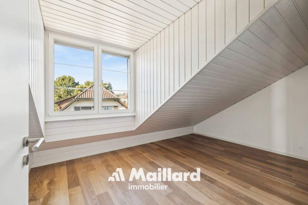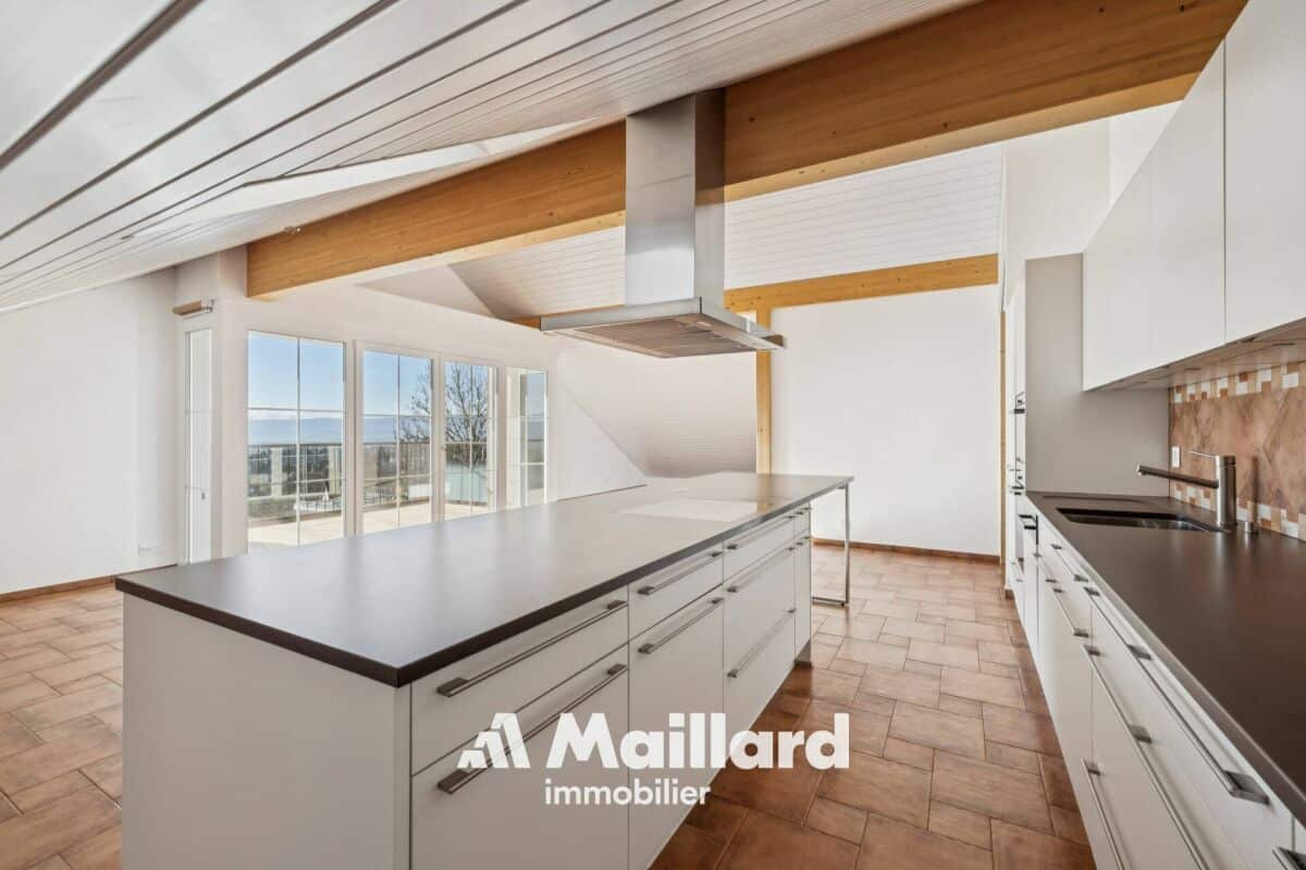 Situé à Belmont-sur-Lausanne, cet appartement se distribue sur 129 m2 dans les combles d'une petite PPE, bénéficiant de beaux volumes et d'une vue panoramique sur le lac Léman et les Alpes.