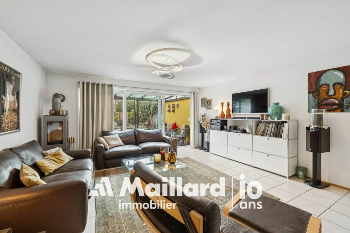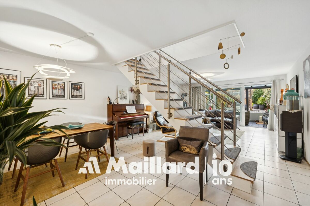 Le rez-de-chaussée, entièrement dédié aux espaces de vie, accueille une cuisine agencée ouverte sur la salle à manger, créant un espace convivial et fonctionnel. Celui-ci se prolonge par un grand séjour lumineux, idéal pour recevoir ou se détendre en famille, avec un accès direct aux extérieurs.