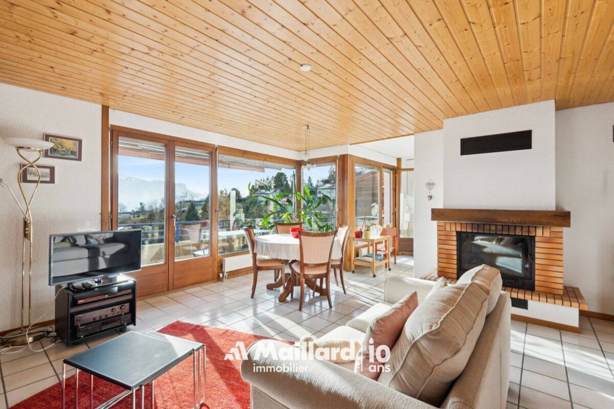 Le séjour constitue le coeur de l'appartement, où une cheminée conviviale vient apporter du charme et une ambiance chaleureuse. Les grandes ouvertures inondent l'espace de lumière naturelle tout en offrant un spectacle permanent sur le lac et les sommets.