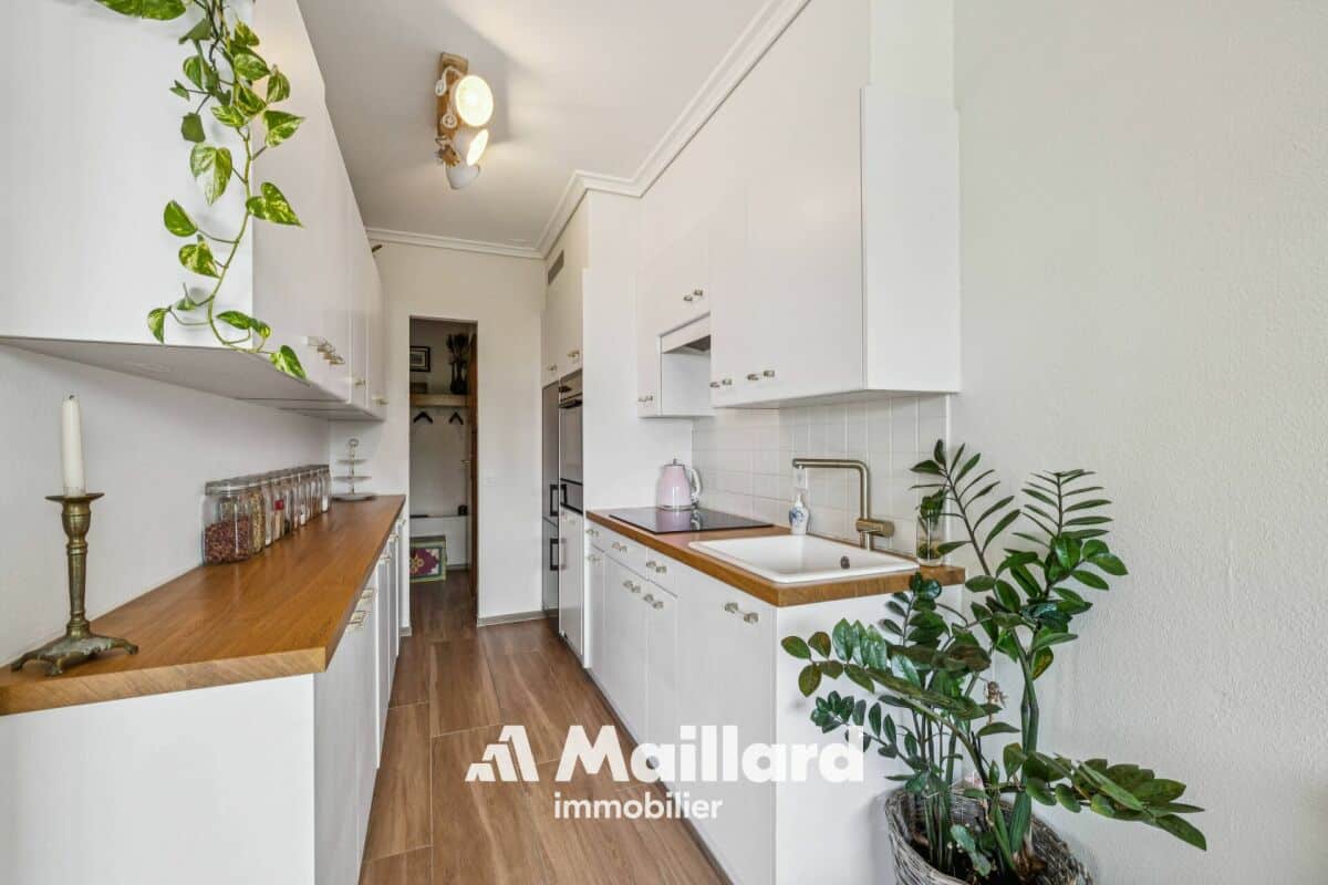 La cuisine, parfaitement équipée, s'intègre harmonieusement à l'espace de vie. Les deux chambres offrent de beaux volumes et un cadre reposant, idéal pour se ressourcer. Une salle de bains élégante complète ce bien.
