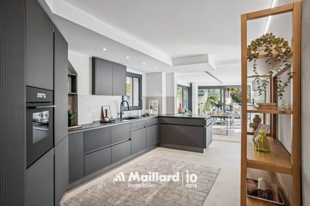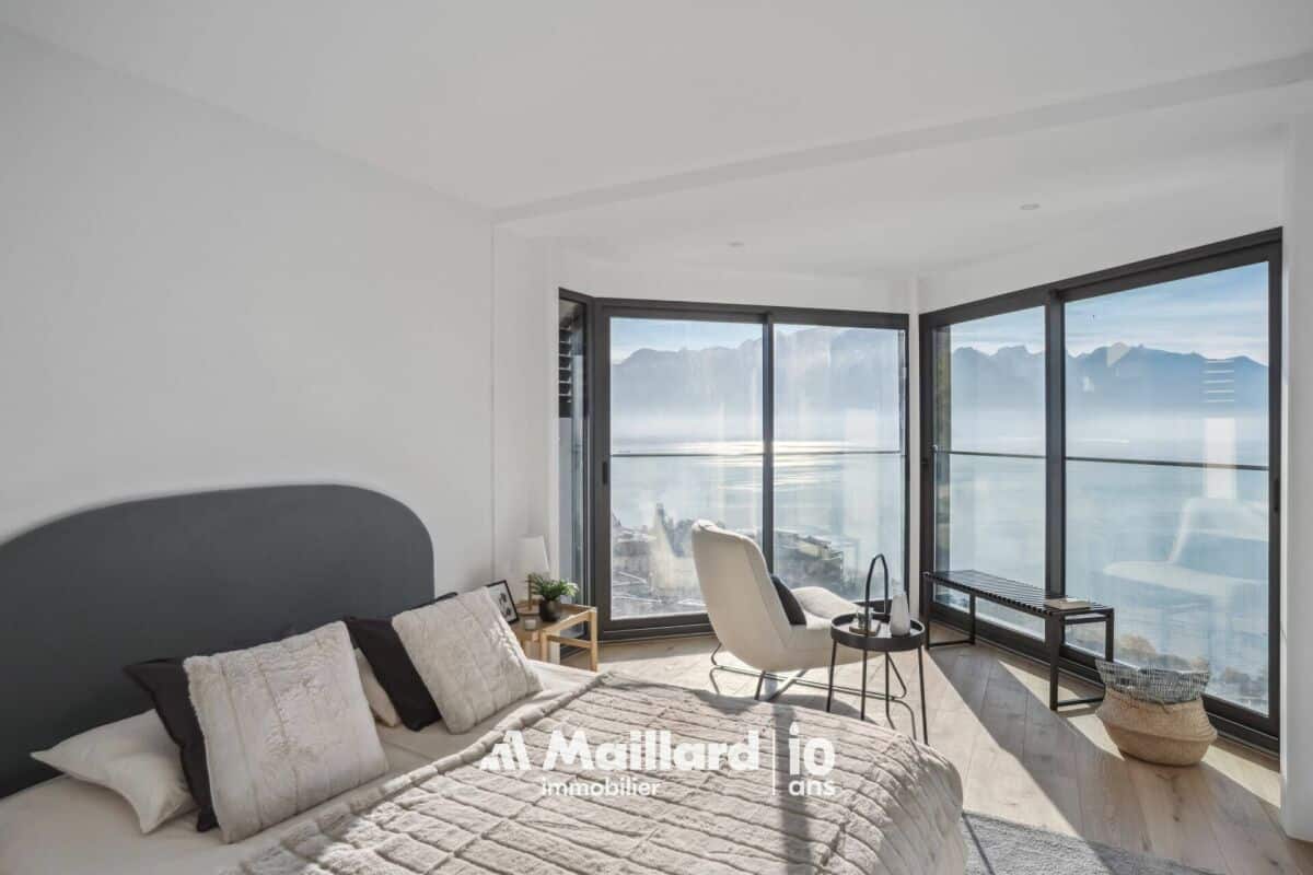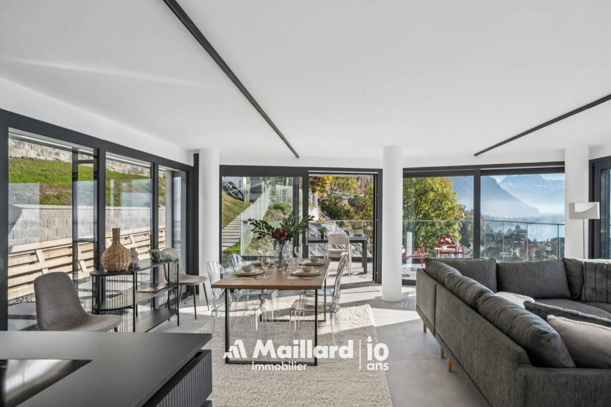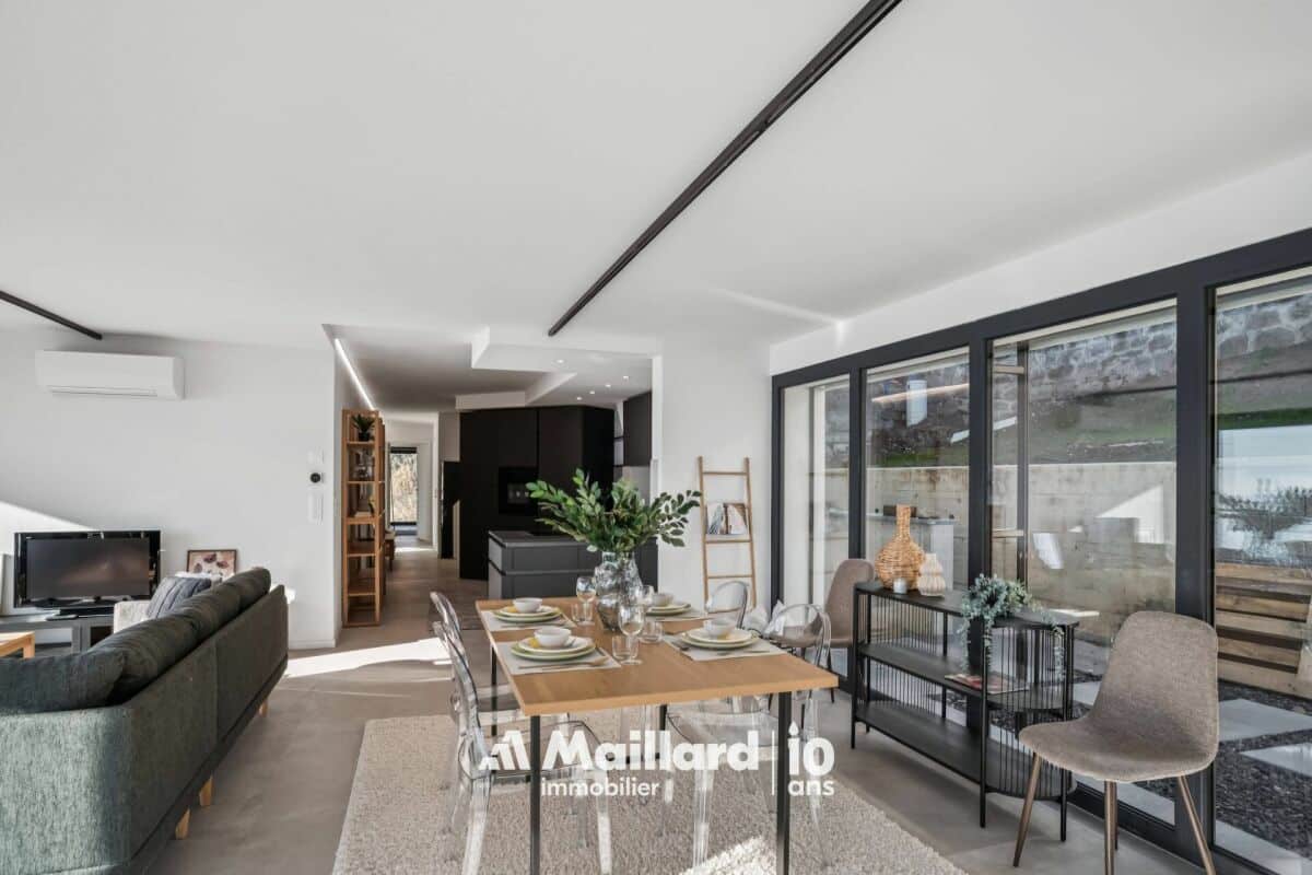 L'espace de vie s'articule autour d'un vaste séjour baigné de lumière, prolongé par une cuisine ouverte aux belles finitions. Les larges baies vitrées donnent accès à une superbe terrasse qui devient une véritable pièce de vie supplémentaire aux beaux jours. Depuis cet espace extérieur, la vue plongeante sur le lac et la chaîne des montagnes constitue un panorama d'exception, changeant au gré des saisons et des lumières.