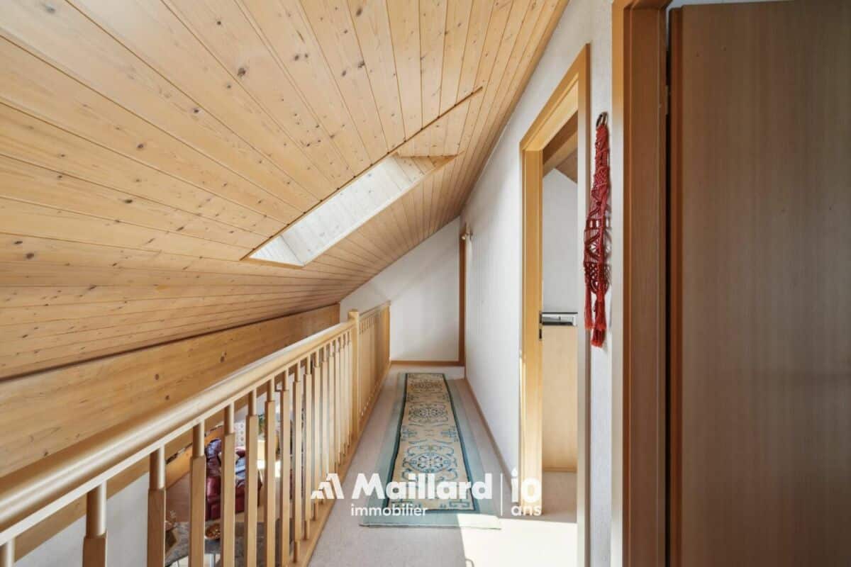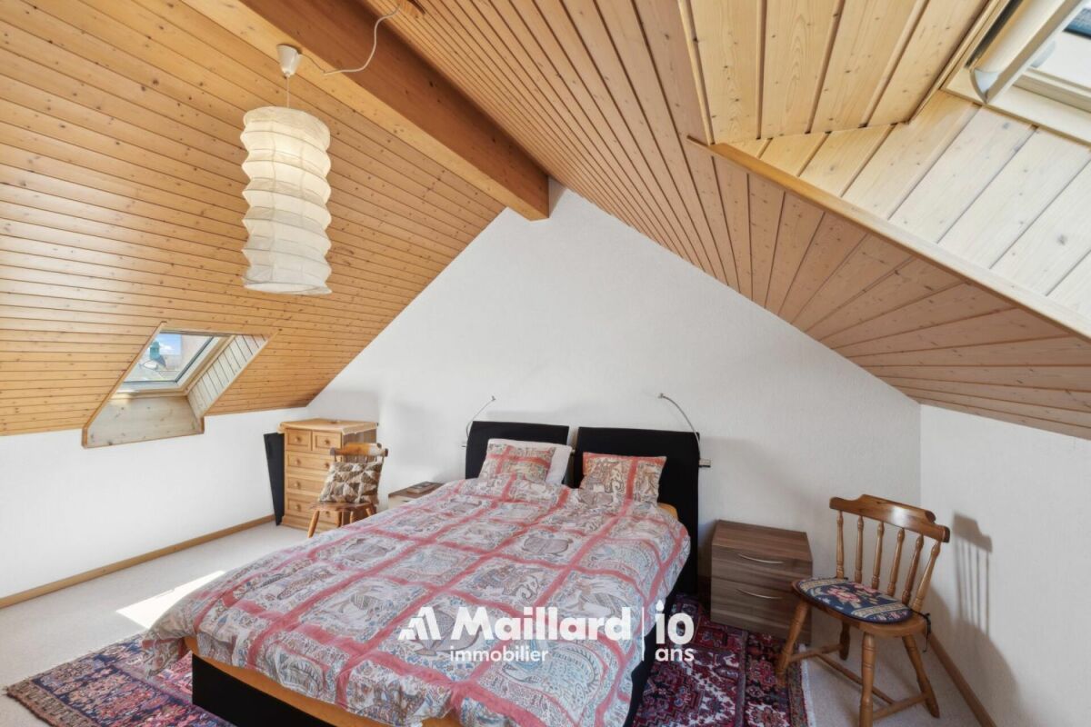 À l'étage, deux chambres mansardées et une salle de bain composent l'espace nuit, bien séparé des pièces de vie.
