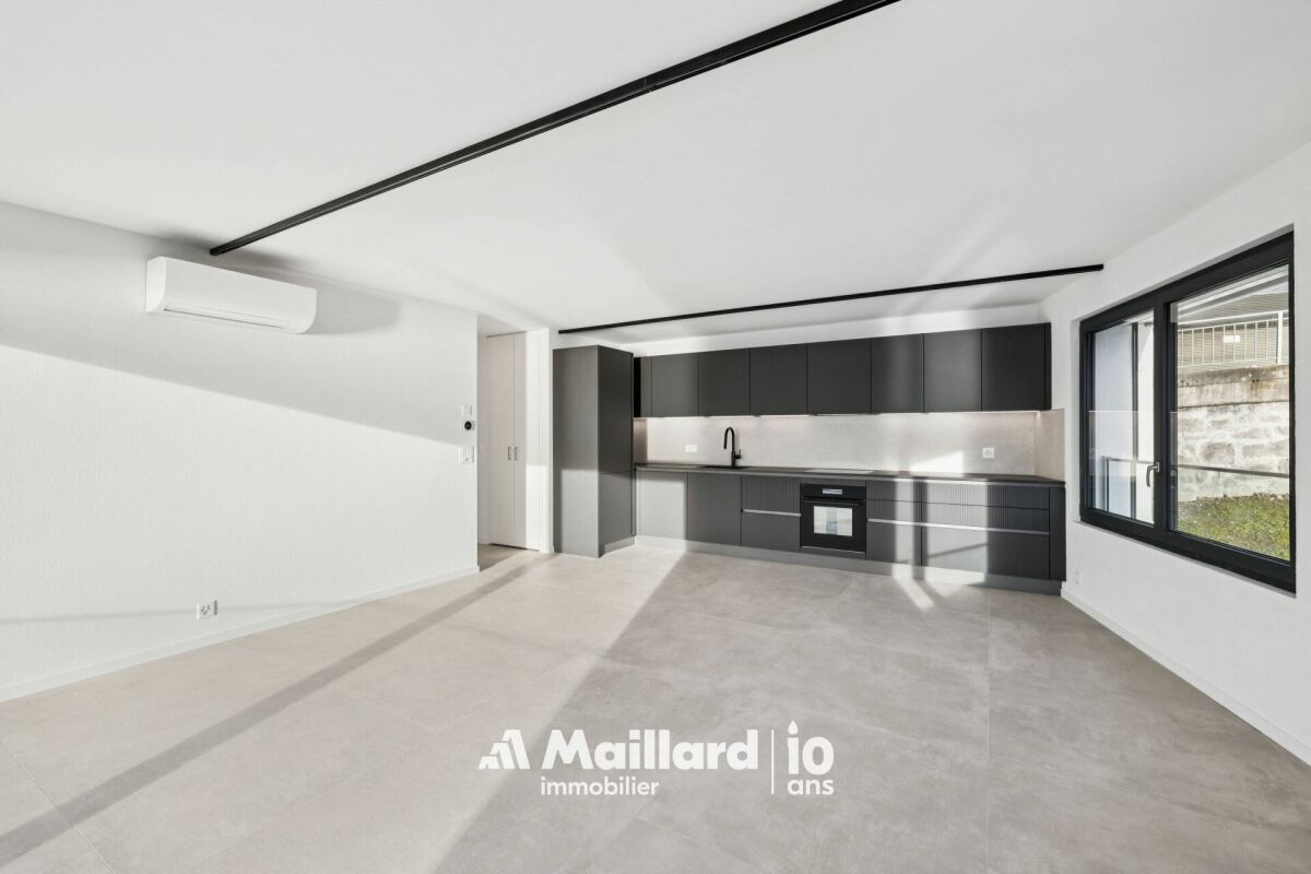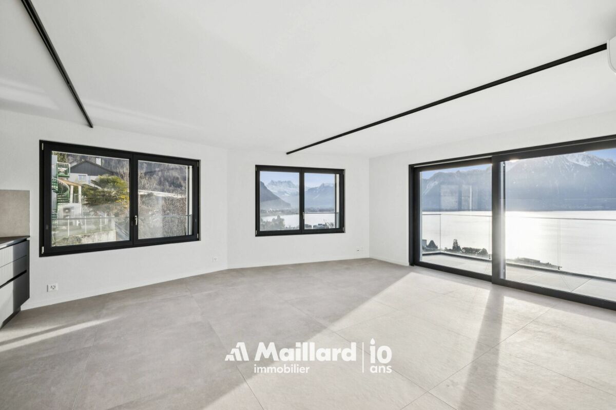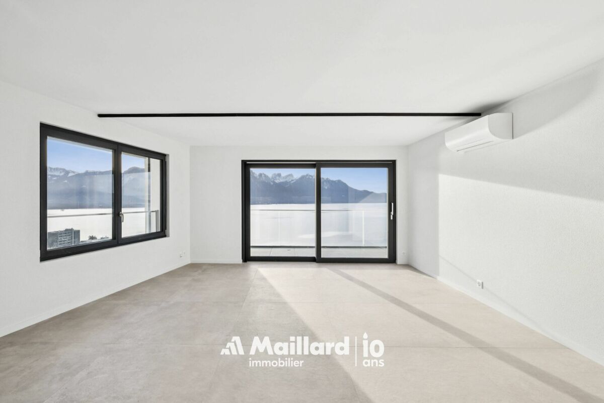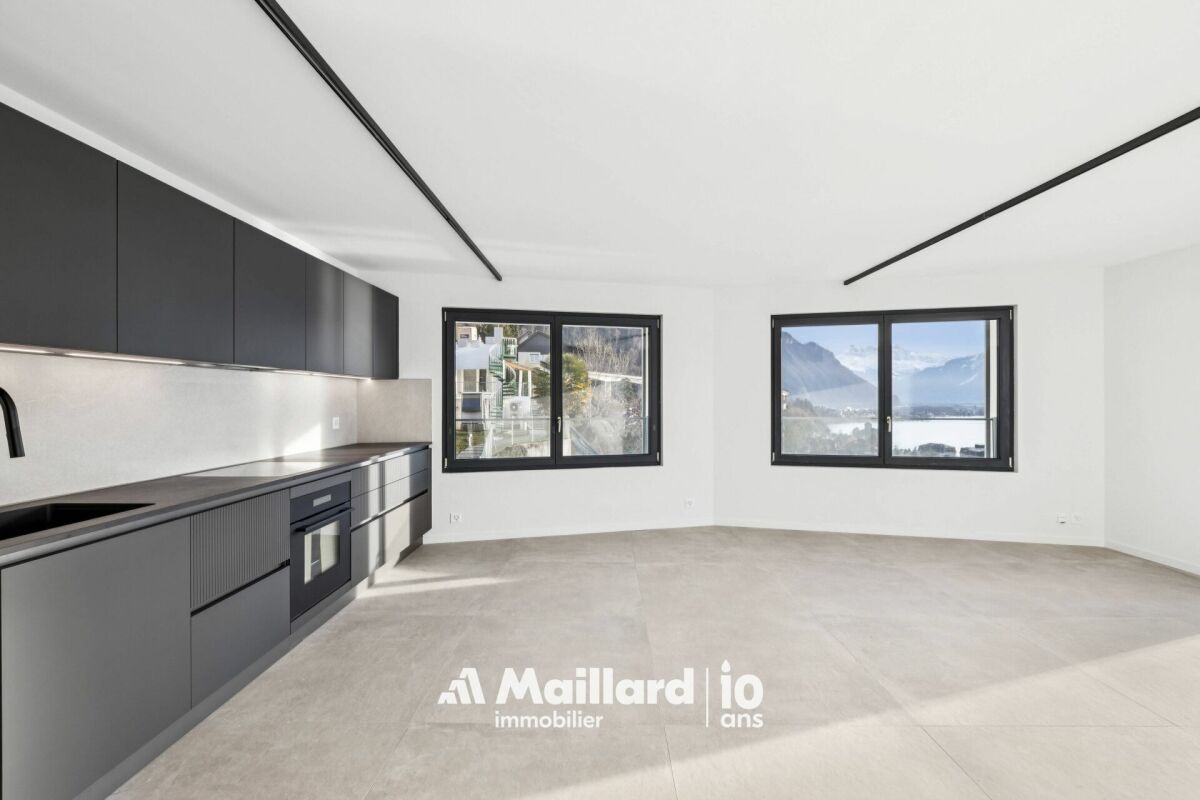 L'espace de vie s'articule autour d'un vaste séjour baigné de lumière, prolongé par une cuisine ouverte. Les larges baies vitrées donnent accès à un superbe balcon qui devient une véritable pièce de vie supplémentaire aux beaux jours. Depuis cet espace extérieur, la vue plongeante sur le lac et la chaîne des montagnes constitue un panorama d'exception, changeant au gré des saisons et des lumières.