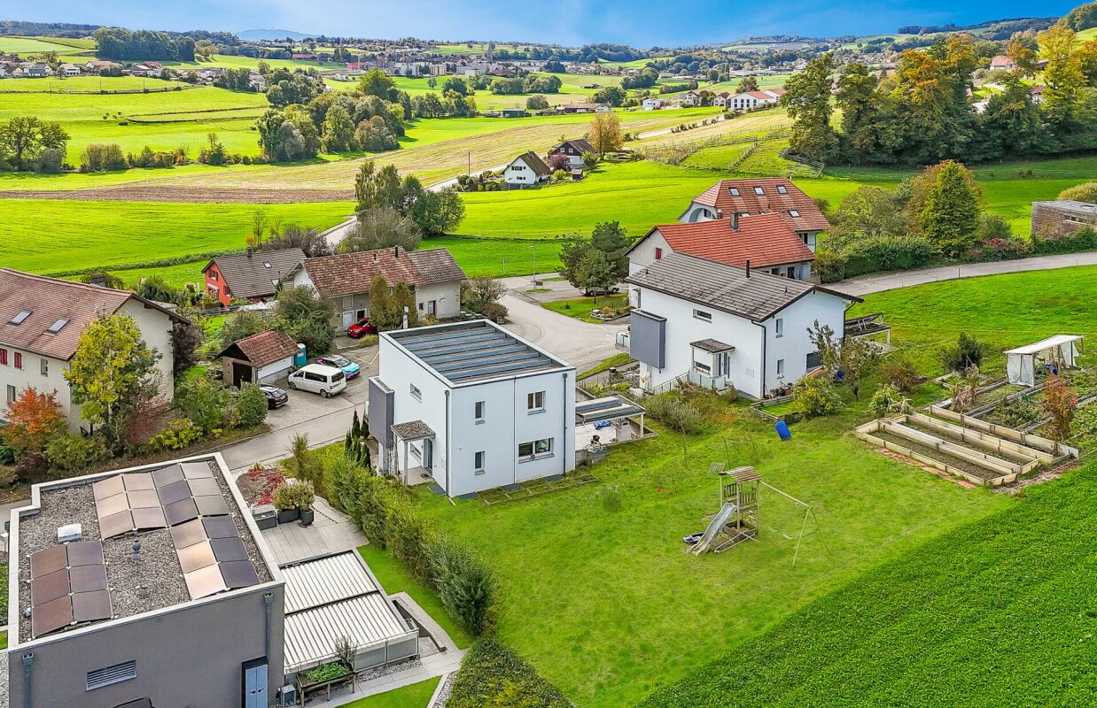 Située sur les hauteurs du charmant village de La Corbaz, elle offre un cadre de vie paisible et une vue imprenable sur la campagne environnante et les Préalpes, le tout sur une parcelle de 718 m².