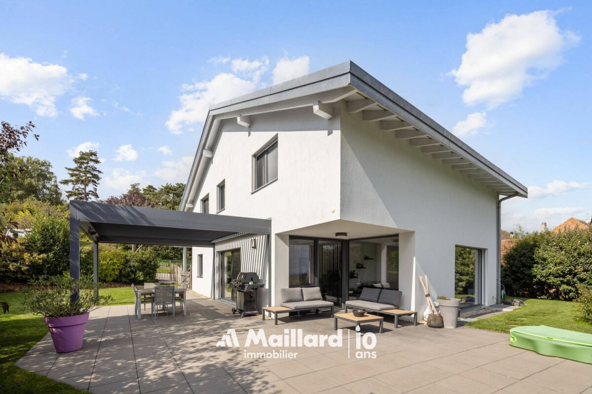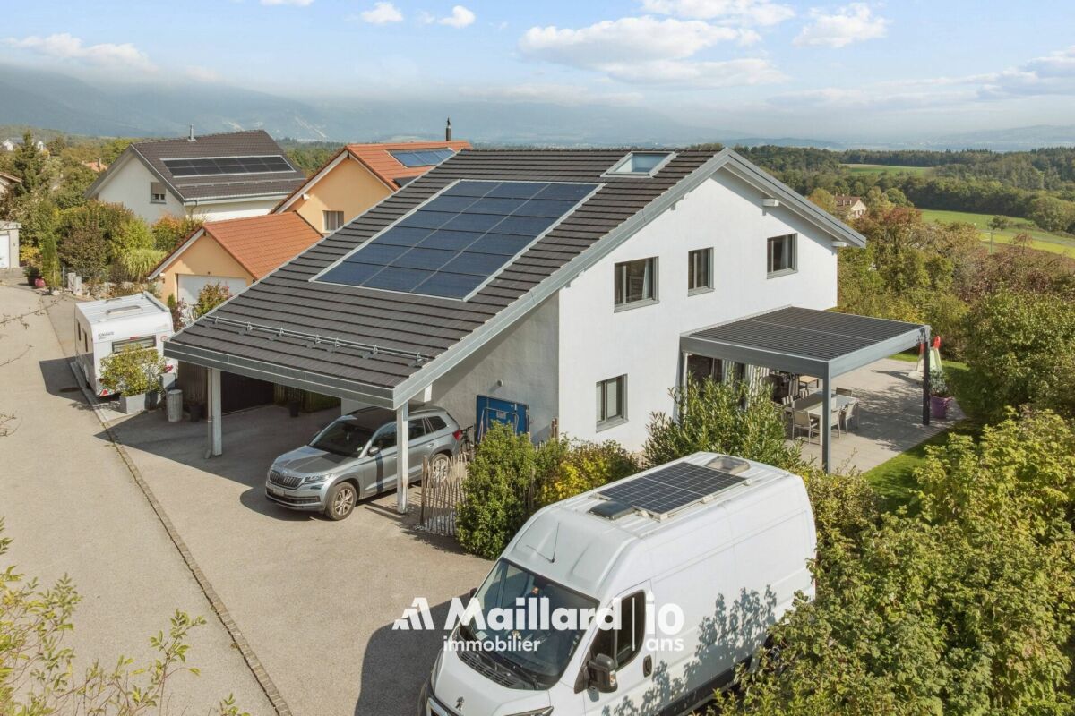 À l'extérieur, un agréable jardin met en valeur une pergola conviviale et un grand jacuzzi, parfaits pour des moments de détente. L'ensemble bénéficie d'équipements modernes tels que des panneaux photovoltaïques et une pompe à chaleur, garantissant confort et efficacité énergétique.