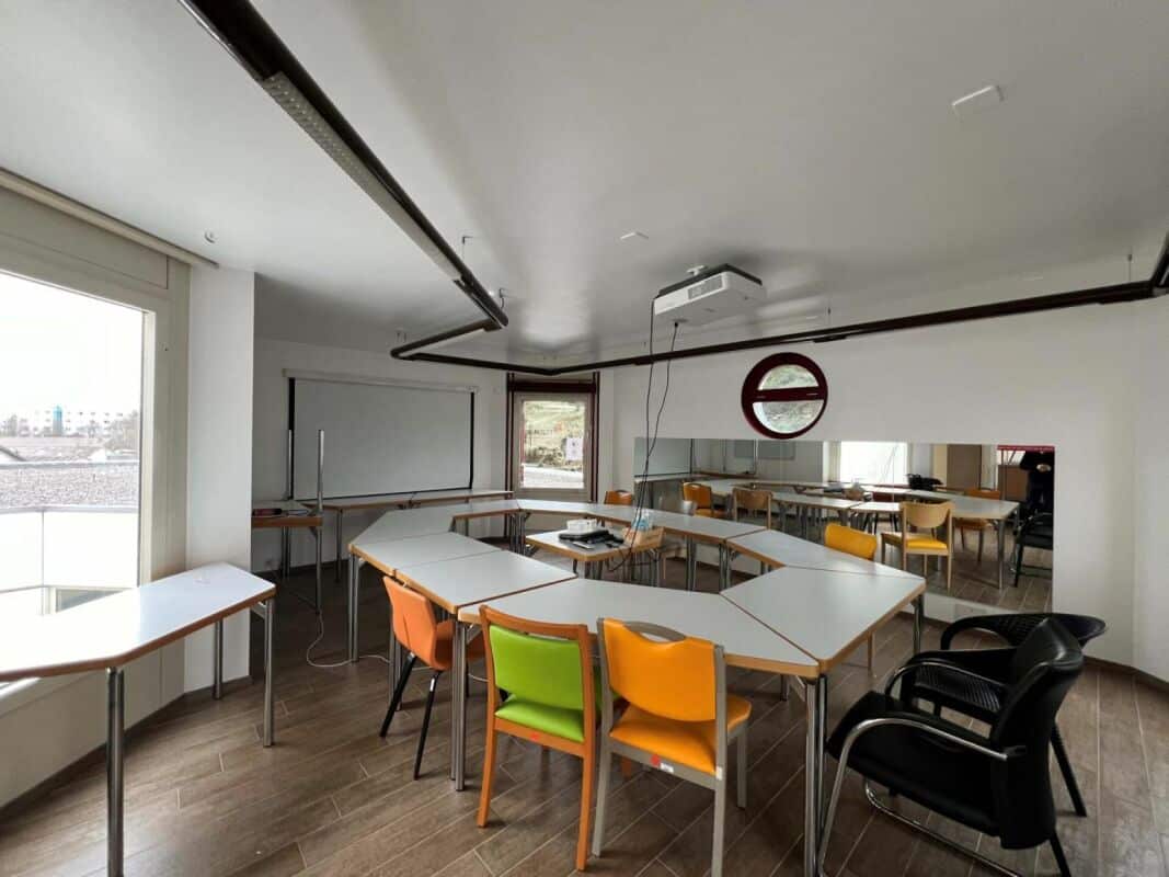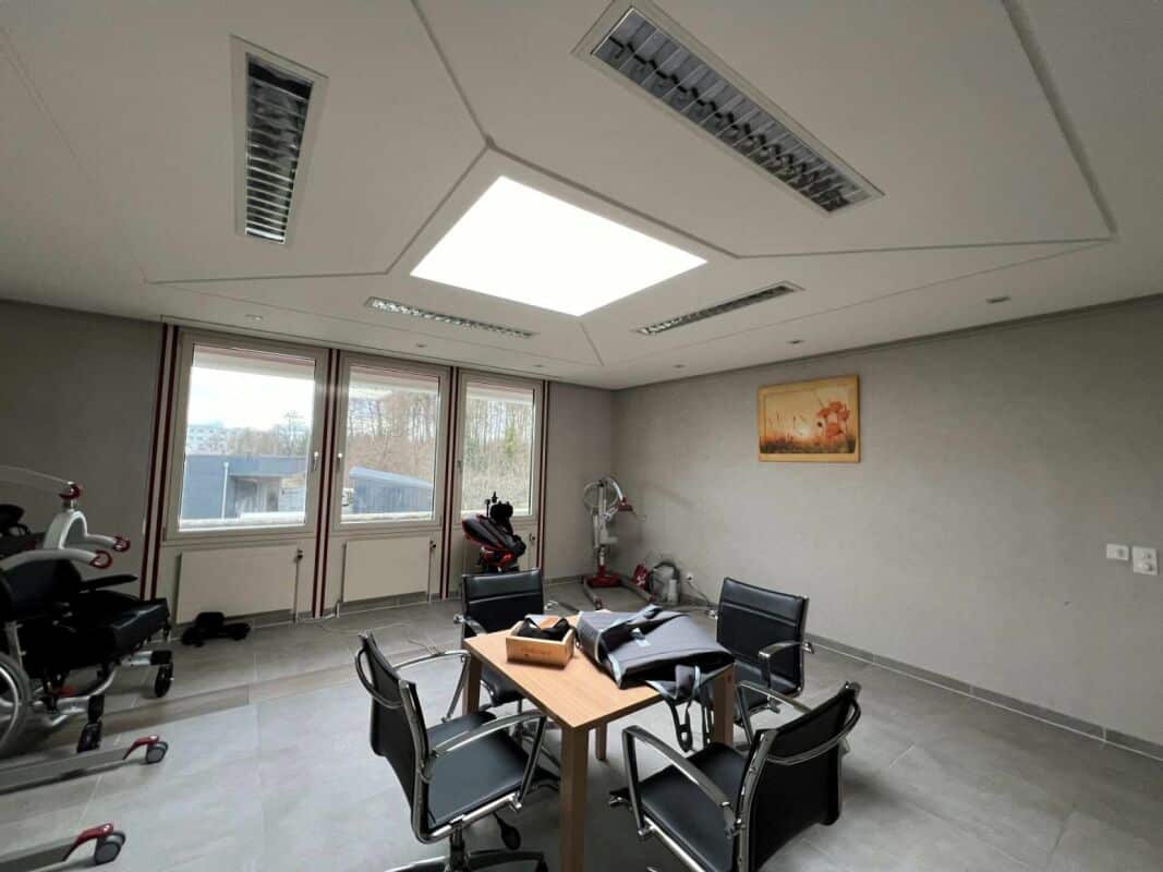 - au rez-supérieur, la réception, des salles d'exposition (showroom ouvert au public), des bureaux, deux sanitaires et une cuisinette, le tout représentant environ 715 m² nets + un balcon couvert d'une quinzaine de mètres carrés.