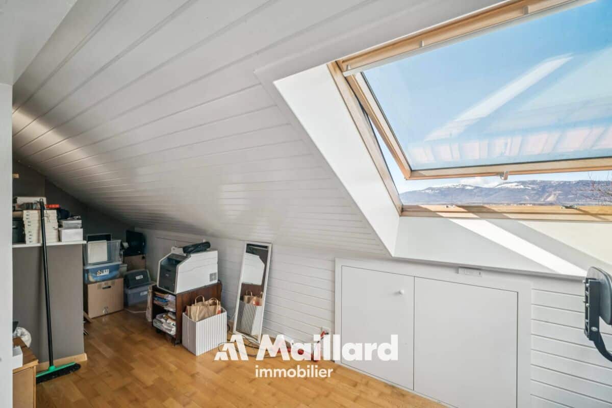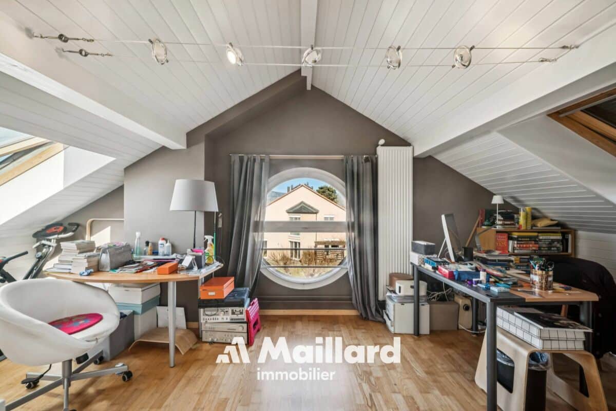 Les combles aménagés, particulièrement lumineux grâce à deux grands Velux, offrent un espace supplémentaire modulable selon vos besoins : chambre additionnelle, bureau, atelier ou espace de rangement.
